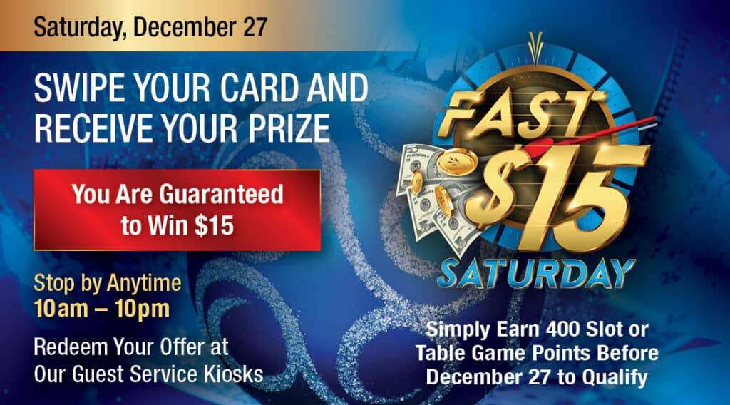 Any of Our Guest Service KiosksFast $15 Saturday Join us and swipe your Players Club card to receive $15 instantly. Qualifying is easy! Please visit our Players Club to learn how you can qualify for […]
