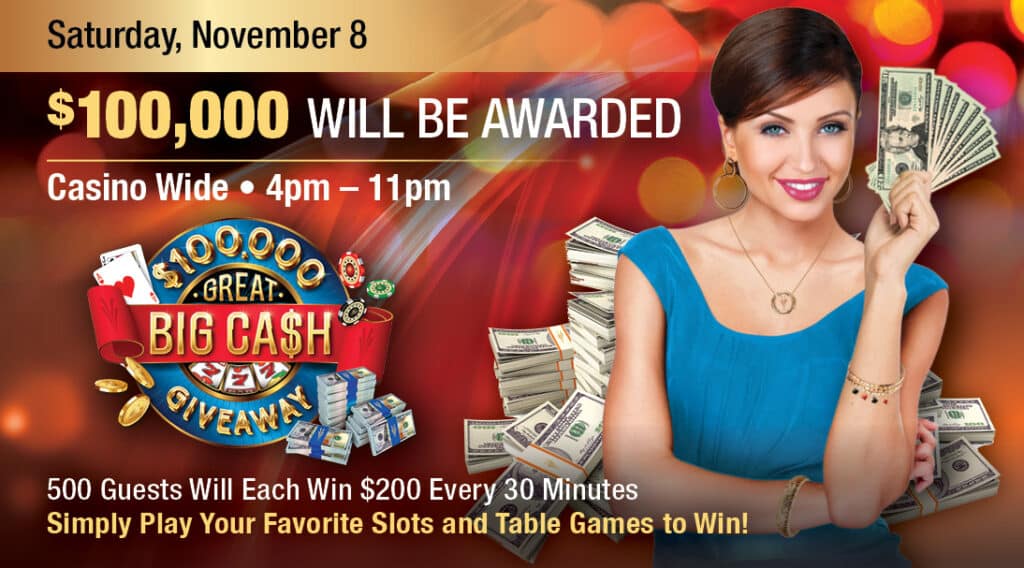 Join us for our $100,000 Great Big Cash Giveaway where you could be one of 500 guests to win $200. Visit us on Saturday, November 8 from 4pm–11pm, where multiple winners will be chosen every 30 minutes throughout the casino. Simply play your favorite slots and table games to win!