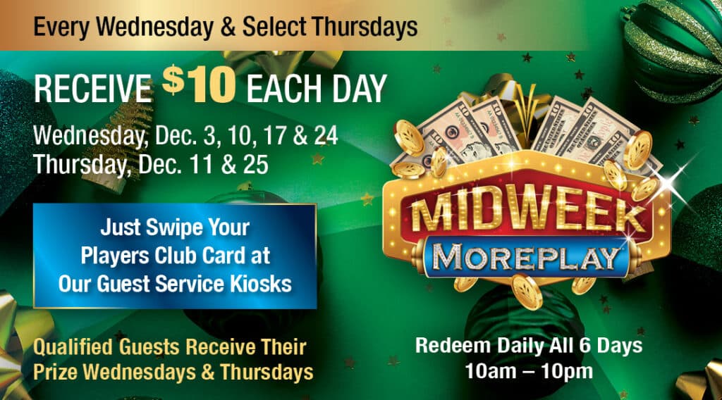 Any of Our Guest Service KiosksMidweek MOREPLAY® Qualified members will simply swipe their Players Club card at our guest service kiosks to receive $10 instantly. Stop by every Wednesday and select Thursdays for this exciting […]