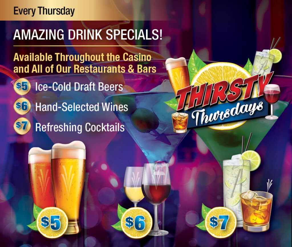 Join us at Valley View Casino & Hotel for our Thirsty Thursdays promotion where you can sip on $5 ice-cold draft beers, $6 hand-selected wines and $7 refreshing cocktails.