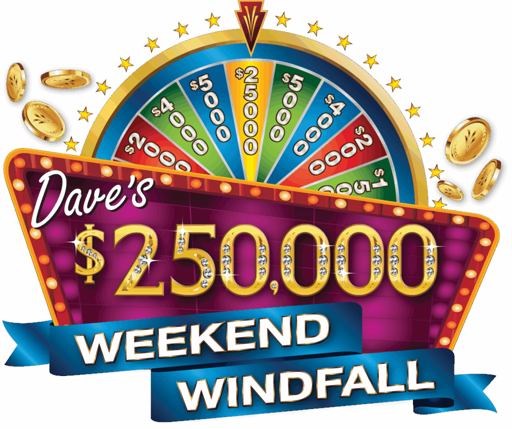 Please join us for Dave’s $250,000 Weekend Windfall happening on Friday, December 12. Every hour from 5pm–9pm, 10 winners will spin to win $200–$1,000 each in MOREPLAY®. Then, at 10pm, 10 additional lucky winners will spin to win $25,000 each. Be at our Main Stage Bar to win big!