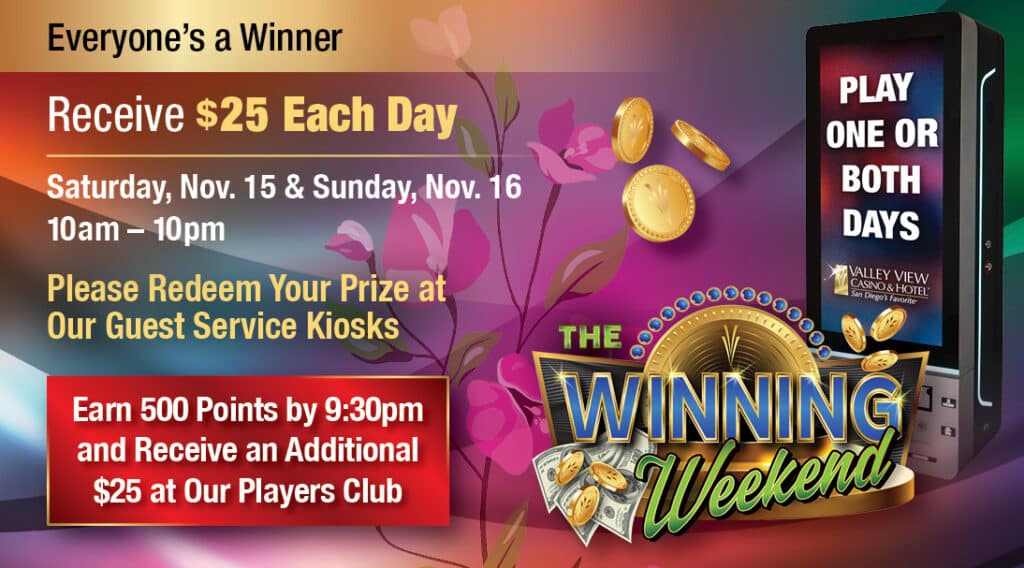 Any of Our Guest Service KiosksThe Winning Weekend Invited guests will swipe their Players Club card to receive $25 instantly during our Winning Weekend event! Every invited guest can swipe one or both days. Visit […]